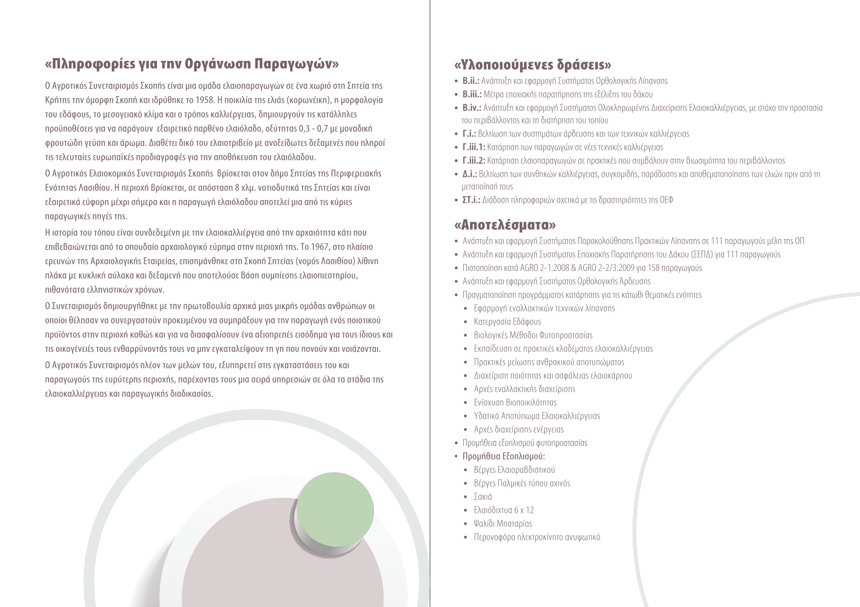 - Τομέας (Δ): Βελτίωση της ποιότητας της παραγωγής ελαιολάδου και επιτραπέζιων ελιών,